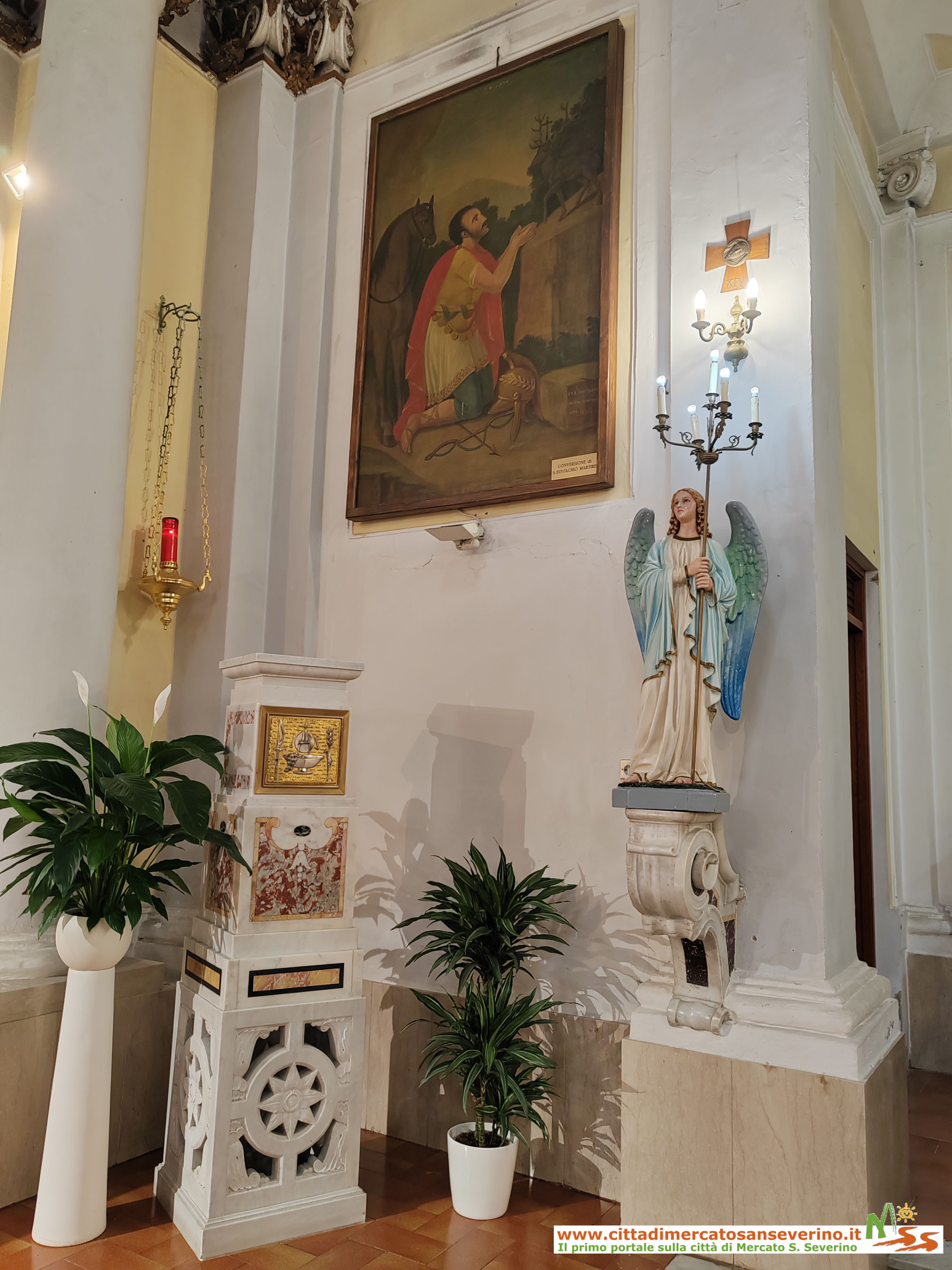 La chiesa ha la porta verso oriente. Oltre all’altare maggiore, è dotata di quattro altari: il primo dedicato all’Addolorata, il secondo è intitolato all’Immacolata, il terzo è dedicato a S. Eustachio, il quarto è intitolato a S. Rocco. In una nicchia si conserva la statua di S. Raffaele.